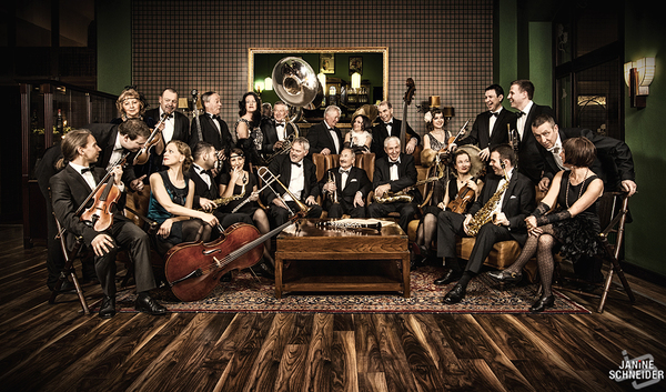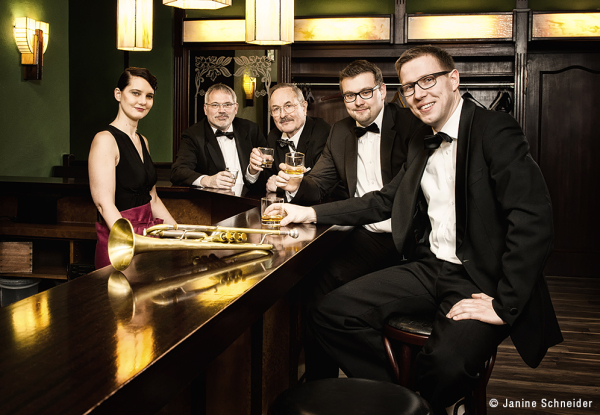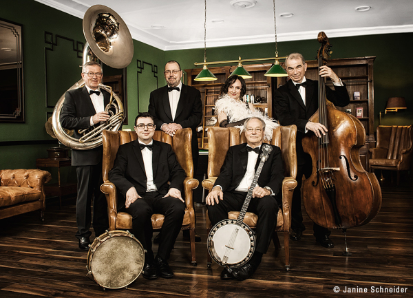 Die Basis des Orchester, die Rythmusgruppe Wolfgang Rodermund (Sousaphon, Kontrabass) Maximilian Behmel (Schlagzeug), Dr. Hans-Peter Hack (Percussion), Julia Reingardt (Klavier), Roland Schäfer (Banjo) und Klaus Berkermann (Kontrabass)