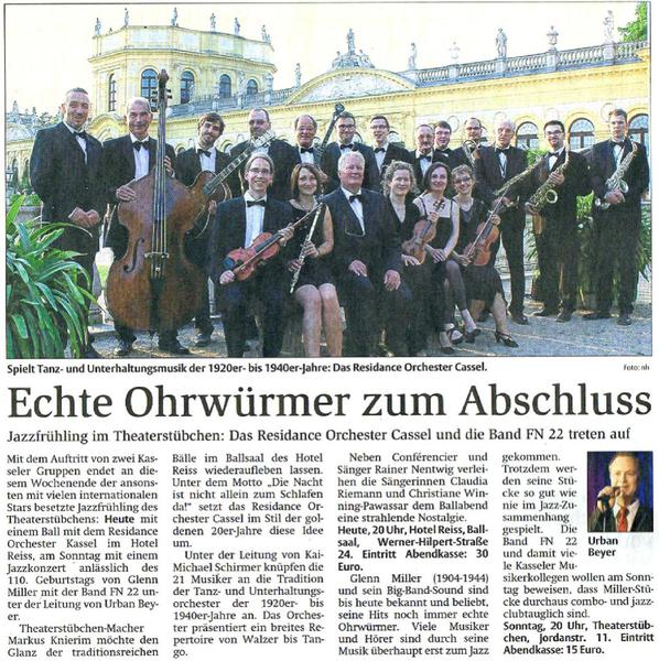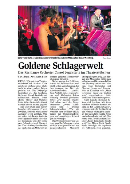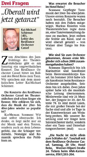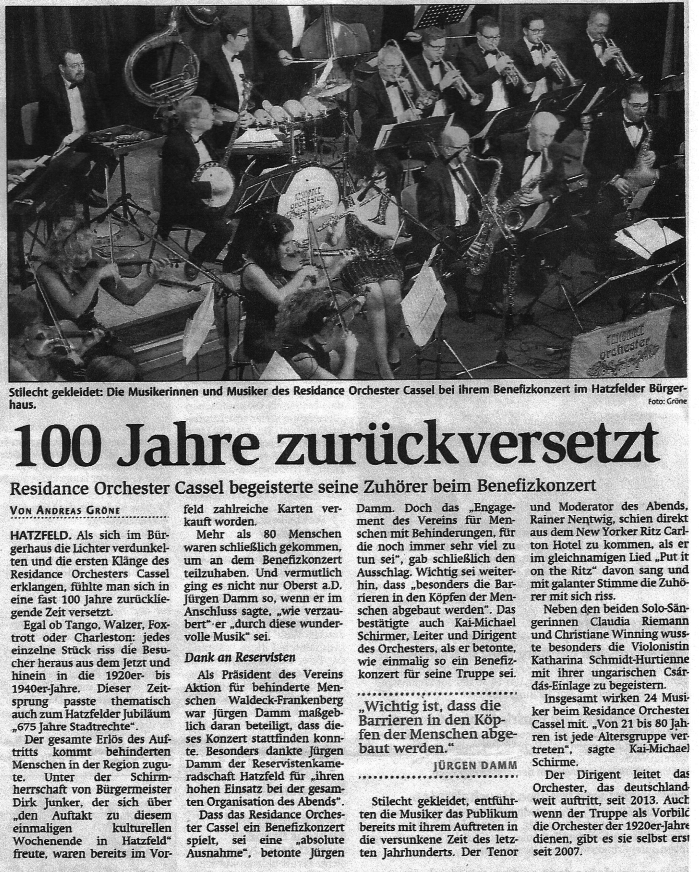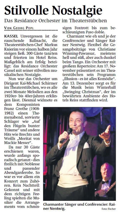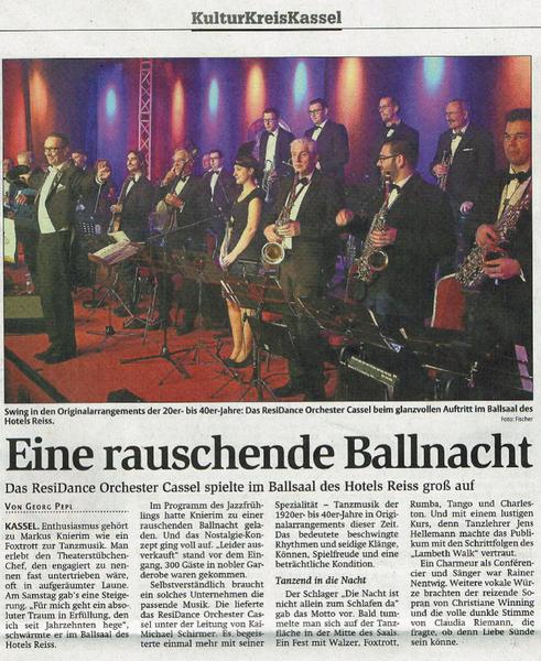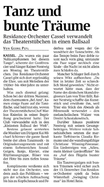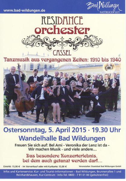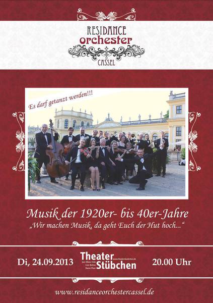 Das "ResiDance Orchester Cassel" wurde 2006 von Musikliebhabern der Tanzmusik der 1920er bis 1940er Jahre gegründet und erfolgreich zur Konzertreife gebracht. Mit den ersten Auftritten 2008 stellte sich das Orchester erstmals dem interressierten Publikum vor. Seit Mai 2011 ist das Orchester mit hinzugewonnenen Musikern und gewachsenem Repertoire deutschlandweit unterwegs und erfreut sein Publikum mit Schlagern der Goldenen Ära.